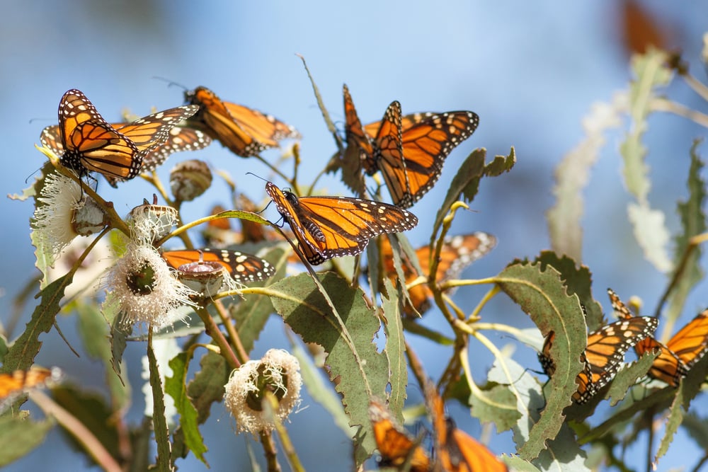 From November through March, Western monarchs cluster in groves of eucalyptus, Monterey pine, and Monterey cypress trees along the California coast. They choose spots within a few miles of the ocean where temperatures stay mild and humidity remains high.