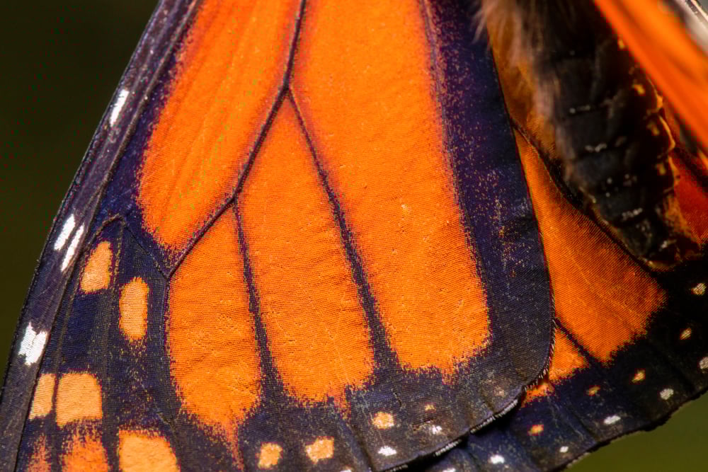 What looks like powder on butterfly wings is actually thousands of tiny scales arranged like shingles on a roof. These scales create the vibrant colors and patterns through both pigments and the way light reflects off their microscopic structures.