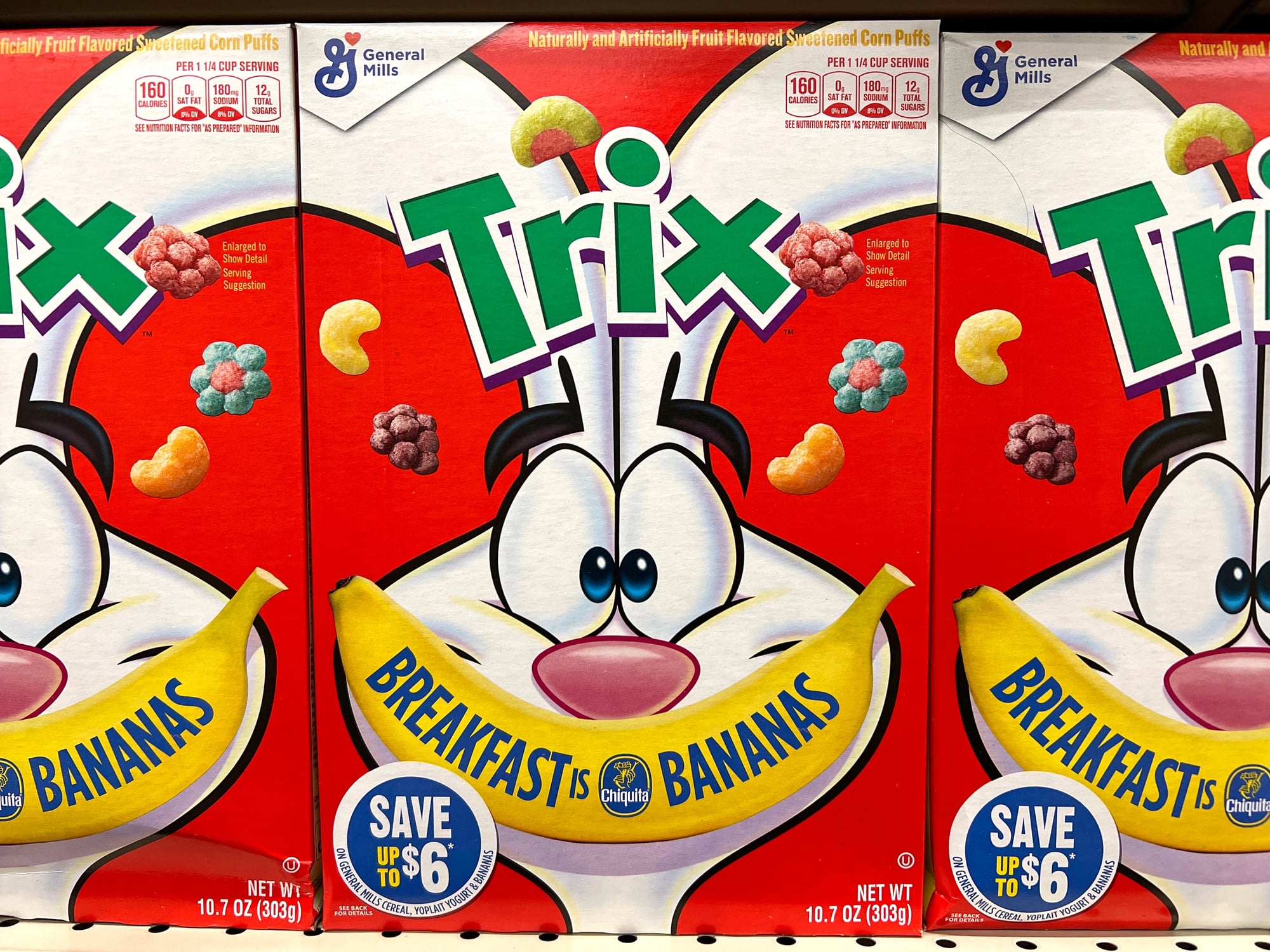 General Mills’ Trix contains 10 grams of sugar per serving and a rainbow of artificial colors including Red 40, Yellow 6, and Blue 1. The cereal’s spherical pieces are primarily refined corn flour with high sugar content and nearly no fiber.