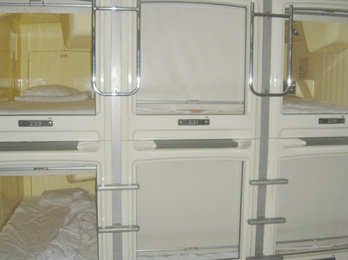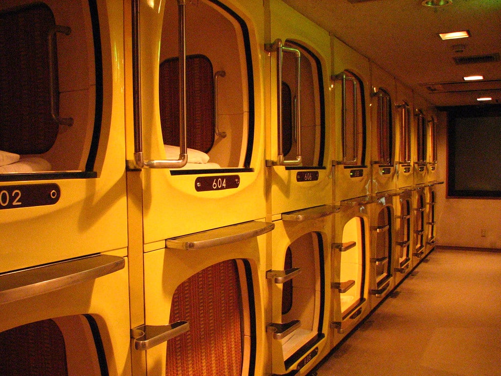 Walk into a capsule hotel and you’ll see what looks like a wall of plastic coffins stacked on top of each other. Each pod measures about six feet long and three feet wide.