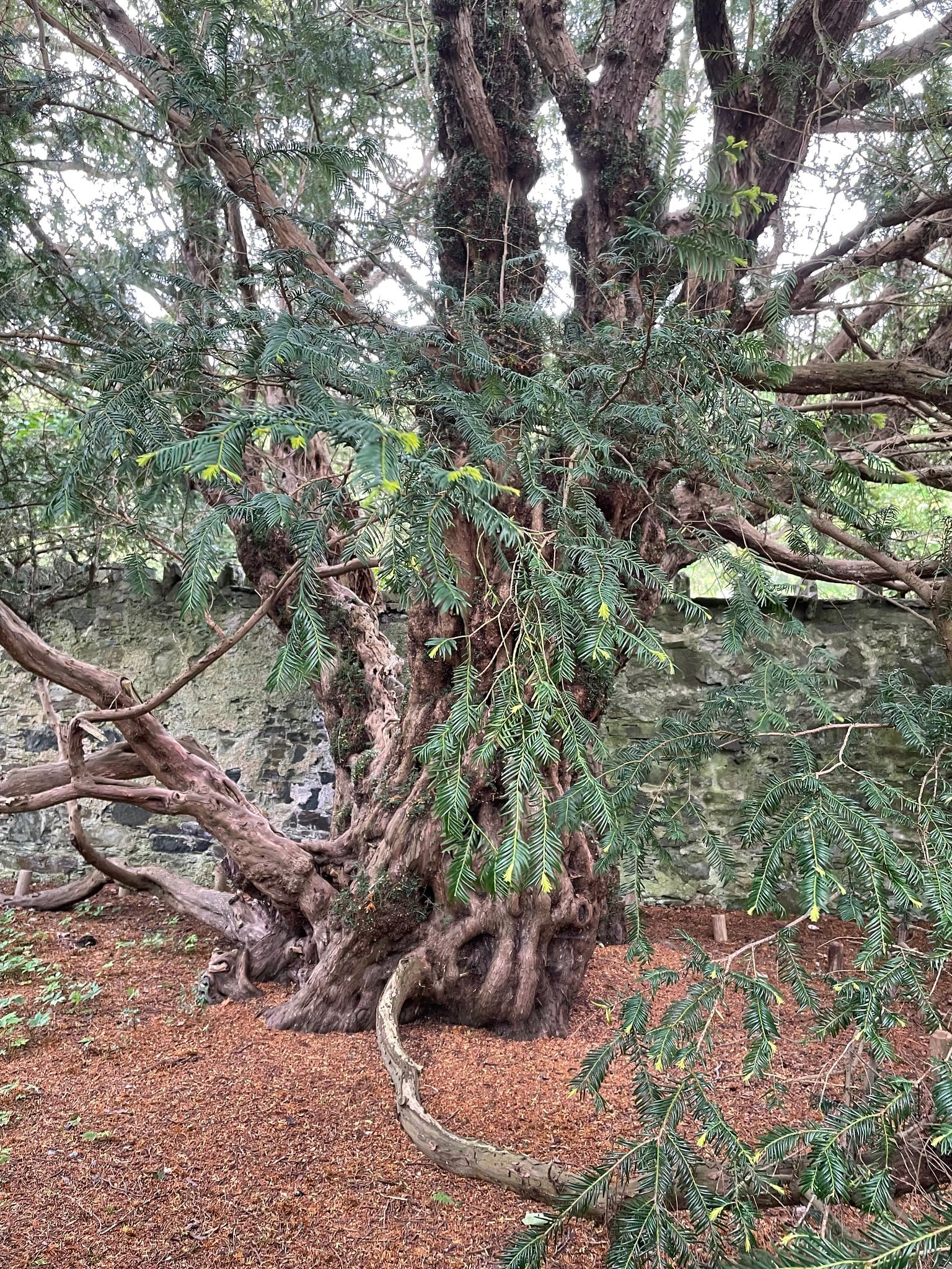 Souvenir hunters damaged the tree over the centuries by taking pieces of bark and wood. Today, a protective wall surrounds it, and in a strange twist, part of the tree that was previously male started producing female berries in 2015.