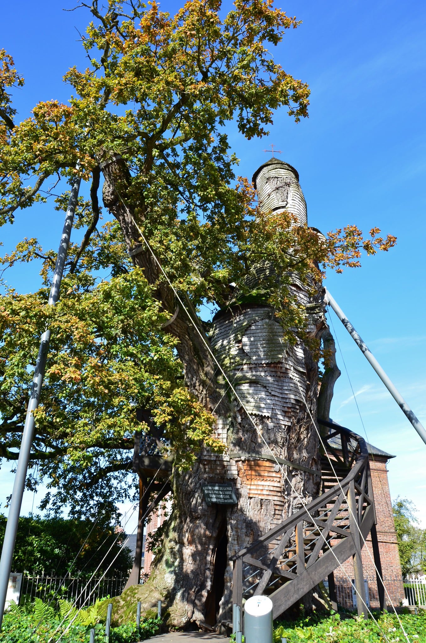 This Norman landmark now draws quiet visitors seeking stillness among gnarled bark and time-worn wood. Spiral steps climb skyward along the trunk, guiding feet toward the elevated sanctuary above ground level.