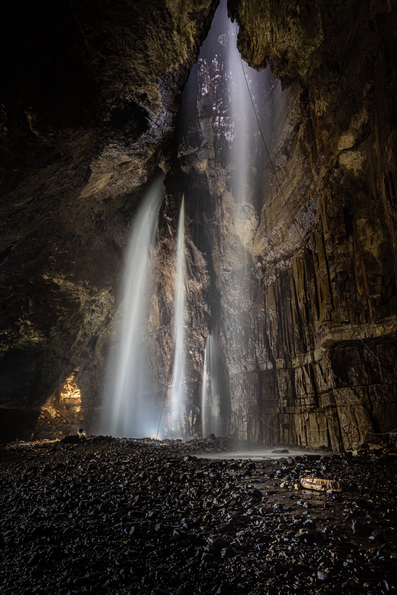 Underground, the water continues through a vast cave system before emerging miles away. Access to Gaping Gill is restricted because of the danger.