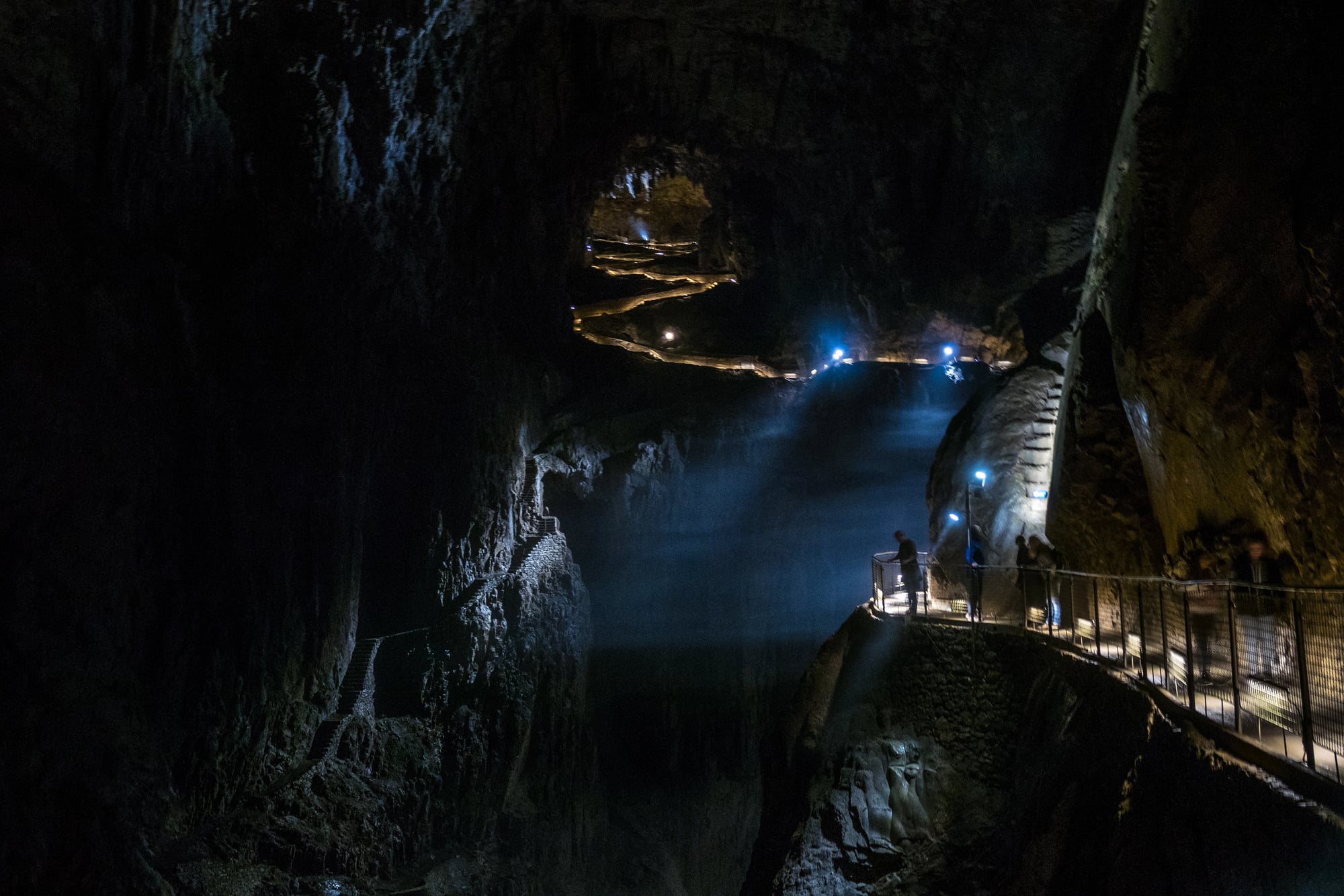 Twice a year, caving clubs set up a winch system that lowers visitors into the main chamber. The descent takes several minutes, hanging in open air as water crashes beside you.