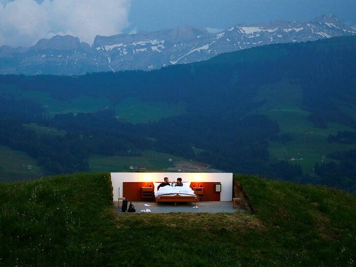 Some hotels aren’t about fancy rooms – yours might pop up anywhere. Take the Null Stern Hotel in Switzerland – it shifts spots now and then.