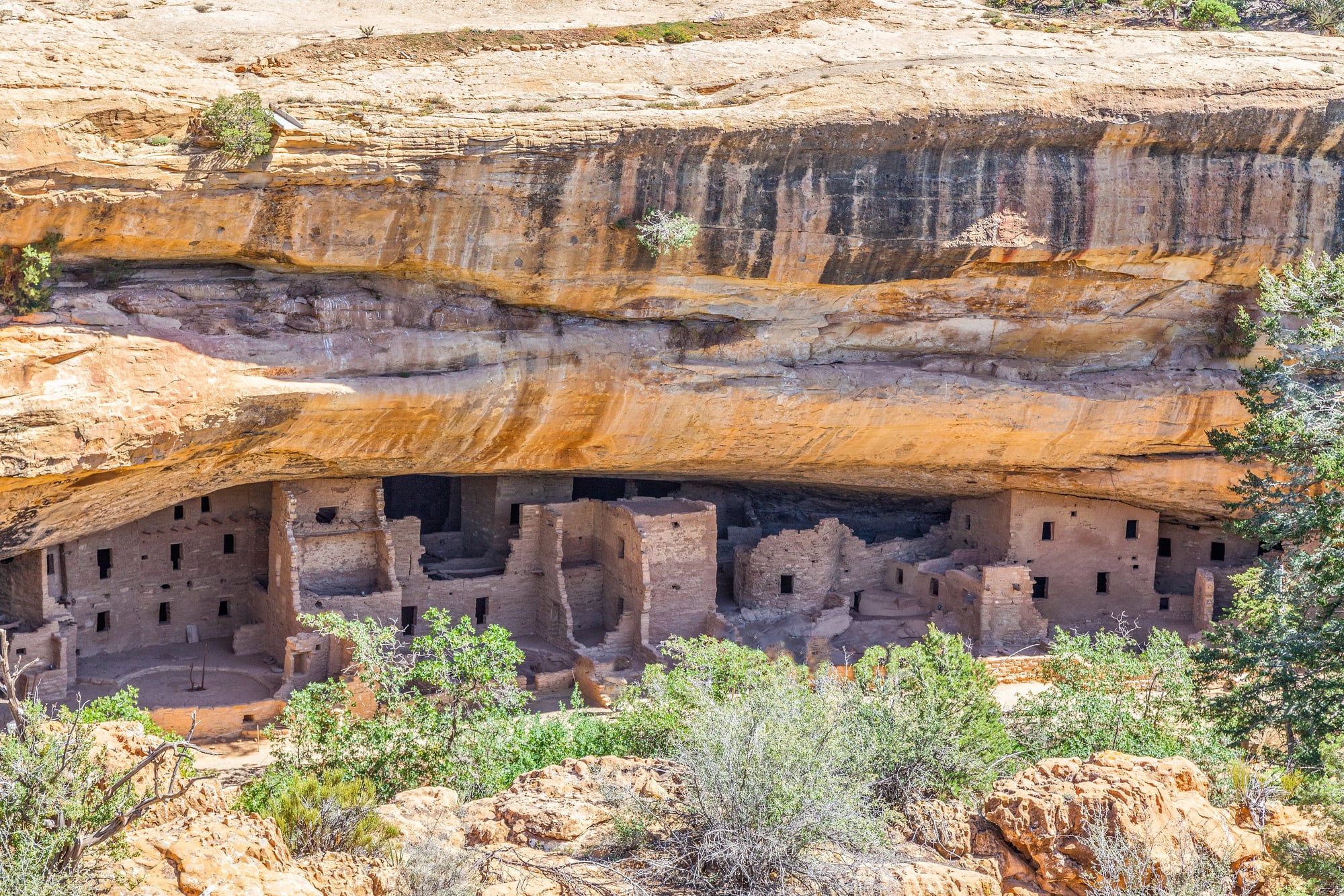 The rock overhang acted like a roof, keeping out rain and snow. The southwest-facing orientation captured winter sun for warmth while the overhang provided shade in summer.