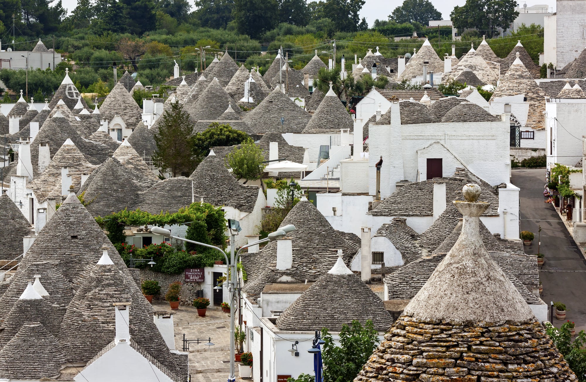 The Puglia region of southern Italy contains thousands of trulli—small, white-washed houses with conical stone roofs. These distinctive buildings use local limestone stacked without mortar in a corbelled dome technique.