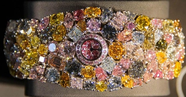 This piece shows up in record books for its sheer weight in diamonds—201 carats of them, in various colors. Pink, blue, white, and yellow diamonds cover the entire surface.
