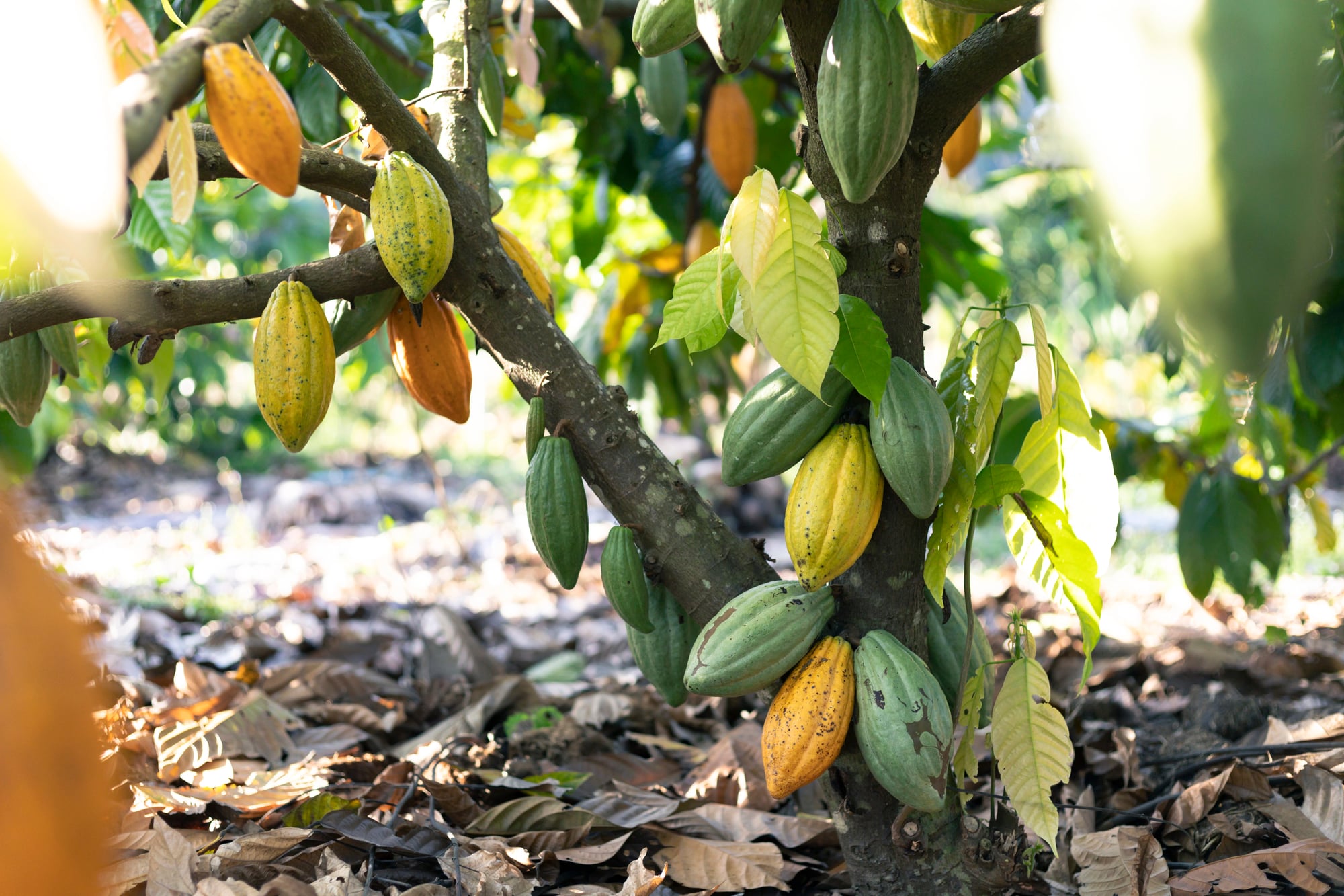 Each pod contains 30 to 40 cocoa beans surrounded by white pulp, and the pods change from green to yellow or red as they ripen. Farmers use machetes to carefully cut the pods off without damaging the tree.