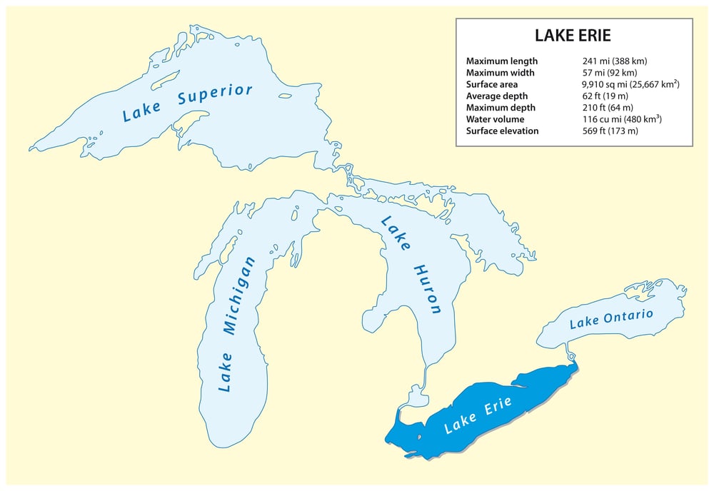 The shallowest of the Great Lakes still manages 9,910 square miles. Vermont-sized. This lake, shared between the U.S. and Canada, could contain the entire Green Mountain State with room to spare, and Erie’s relatively shallow waters make it the warmest of the Great Lakes.