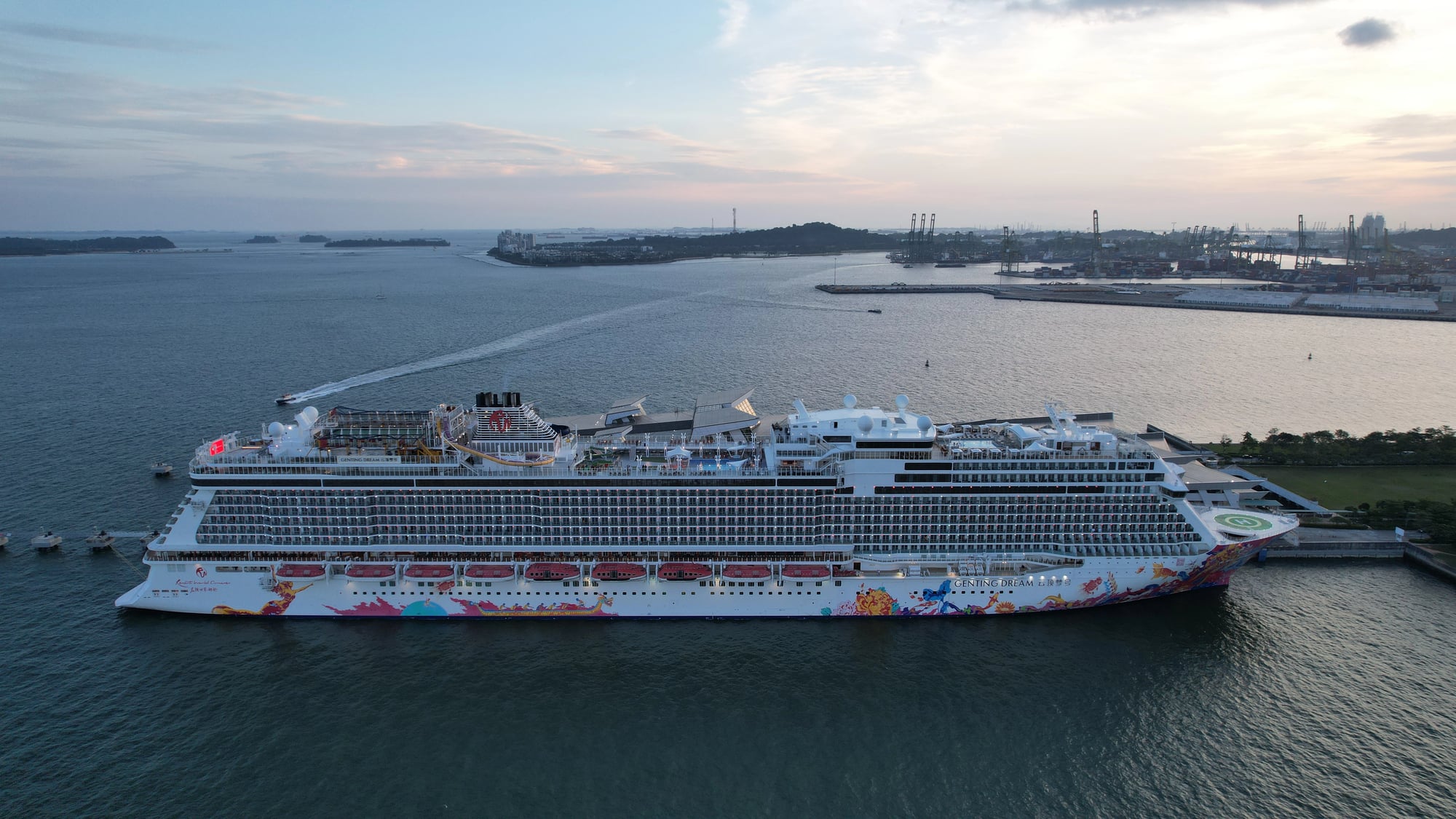 The vessel holds 5,622 passengers and features activities tailored to Asian preferences, including karaoke rooms and specialty restaurants. It has a skydiving simulator, bumper cars, and virtual reality gaming. The ship also includes two-story family suites with slides that connect the upper and lower floors.