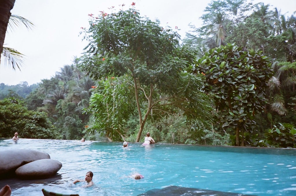 Green rice paddies and dense tropical vegetation form the backdrop, and the infinity edge seems to blend directly into the canopy below.