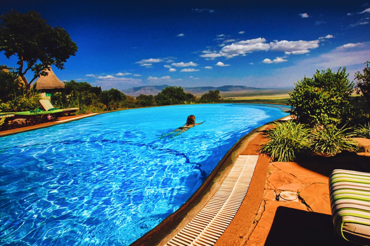 Most infinity pools overlook oceans or cityscapes, but this one in Tanzania provides views of an active watering spot where elephants, buffalo, and lions come to drink. You can float in temperature-controlled water while watching wildlife interact just yards away in their natural habitat.
